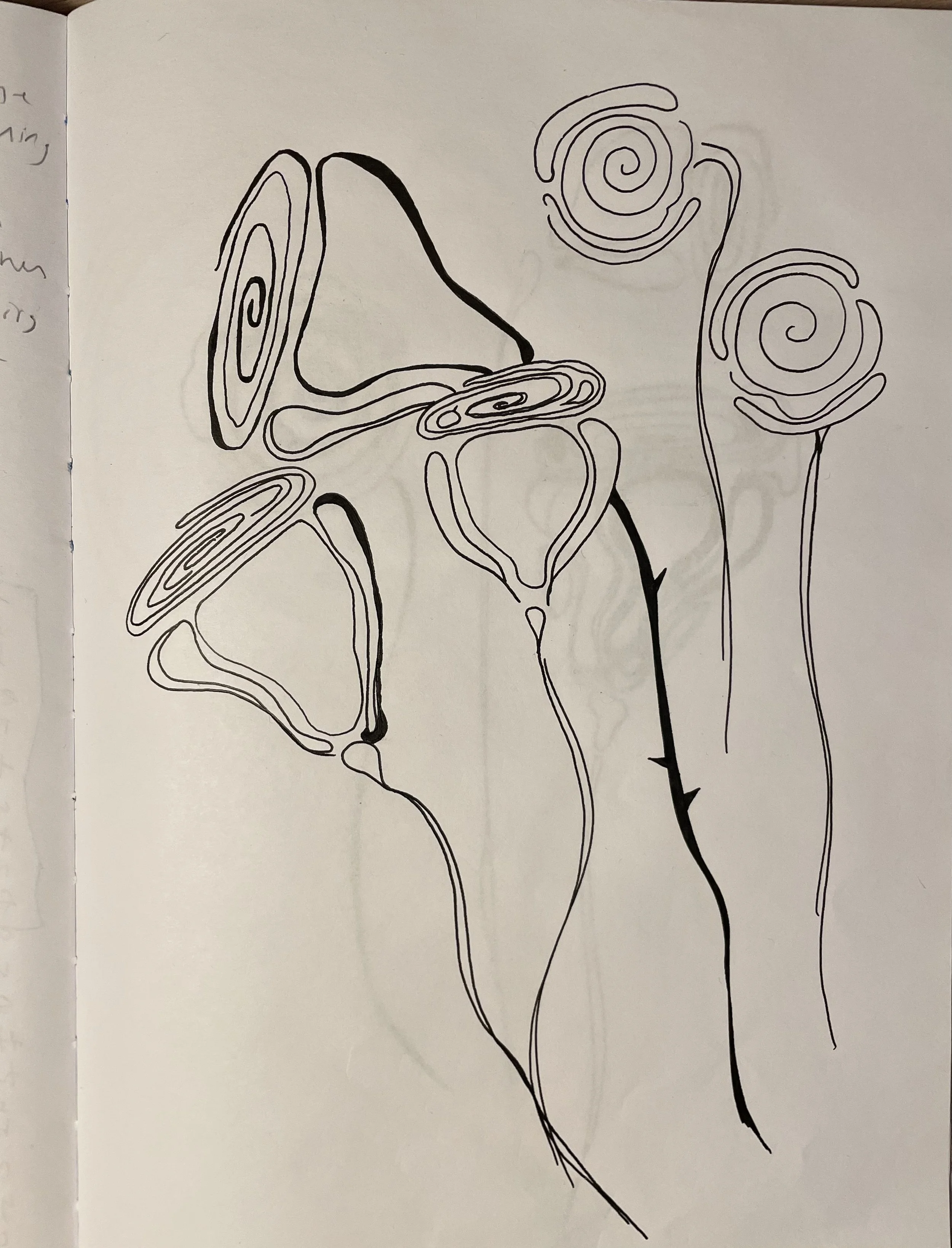 I further discovered the mask of blind contour when I gave myself permission to doodle during class—even if it meant that I was dividing my attention. Then somehow I focused more, looked differently and captured something more than what my eyes could see. The pen as an extension of the body. The body as an extension of the eye. The eye as the bridge in the space between myself and my subject. Eventually this exploration transformed my marks and the pages began to explode with bending flowers.